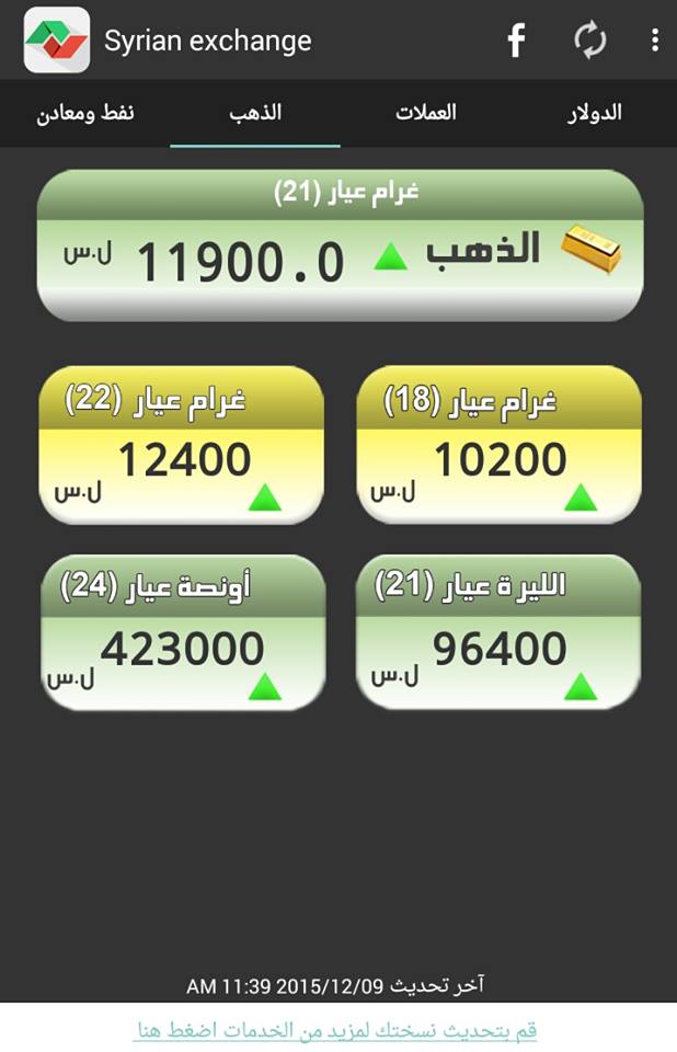 واستعاد الذهب بدمشق أعلى سعر سجله في تاريخ سوريا، عند 11900 ليرة لغرام الـ 21، و10200 ليرة لغرام الـ 18.