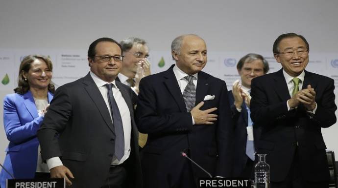 واعلن رئيس قمة المناخ وزير الخارجية الفرنسي لوران فابيوس "انظر (الى الوجوه) في القاعة وارى ان رد الفعل ايجابي ولا اسمع اعتراضا، تم تبني اتفاق باريس حول المناخ" ما اثار عاصفة من التصفيق استمرت لدقائق في قاعة المؤتمر وسط تبادل التهاني واجواء من الفرح.