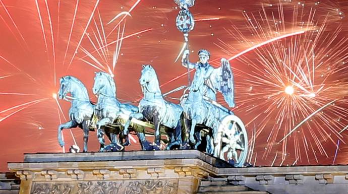ويعد إطلاق الألعاب النارية احتفالاً بحلول السنة الميلادية الجديدة عادة تقليدية في منتصف ليل 31 ديسمبر/كانون الأول، وتبث محطات التلفزيون عرض الألعاب النارية الجذاب عند بوابة "براندنبرغ" في برلين كل عام على الهواء مباشرة.