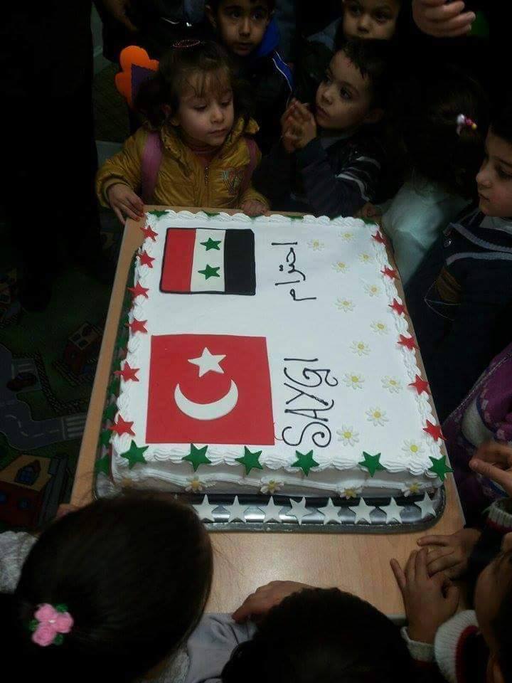 بدأت الحكاية عند اختيار جمعية تركية لروضة "الطفل المبدع" القريبة من ساحة الجمهورية، كمكان للاحتفال بفعاليات الصداقة بين الشعبين التركي والسوري، بدون التنسيق مع المسؤولين السوريين عن الروضة، وبحضور عدد من وسائل الاعلام التركية، وأثناء ذلك حضر علم النظام إلى جانب العلم التركي على قالب "الكاتو"، فما كان من معلمة الروضة السورية إلا أن اعترضت على حضور العلم، لكن الازدحام وعدم اتقانها للغة التركية منعاها من إيصال اعتراضها لأعضاء الجمعية المحتفلين.