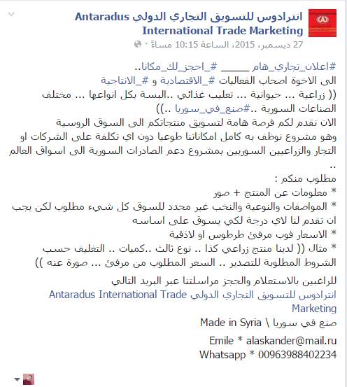 وسبق لشركة انترادوس أن أعلنت قبل أيام على صفحتها في "فيسبوك"، عن استعدادها لتسويق كافة المنتجات الزراعية والحيوانية والمعلبات الغذائية إلى الأسواق الروسية دون تحميل المزارعين والتجار أي تكلفة وفق ما أسمته بمشروع دعم الصادرات الوطنية.