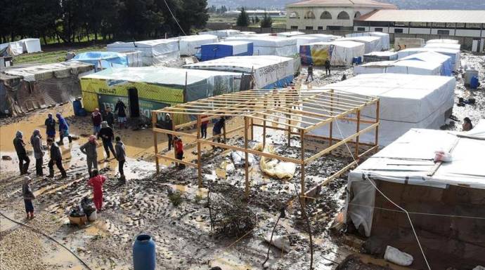 تعرض مخيم "السمونية" للاجئين بمنطقة عكار شمالي لبنان، أمس الجمعة، لعاصفة شتوية شديدة، أدت إلى تضرر نحو 900 عائلة سورية بعدما أغرقت الأمطار خيامهم التي بدت وكأنها تطفو فوق بحيرة من المياه، مما زاد من معاناتهم الإنسانية.