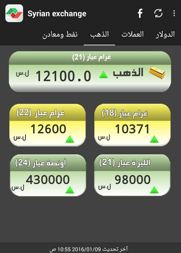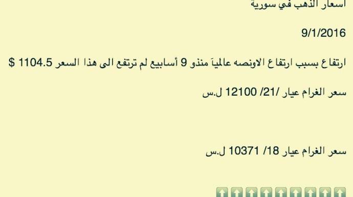 وحسب جمعية الصاغة بدمشق، ارتفع غرام الـ 21 ذهب، 100 ليرة، ليصبح بـ 12100 ليرة، فيما أصبح غرام الـ 18 بـ 10371 ليرة.