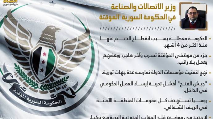 قال وزير الاتصالات والصناعة في الحكومة المؤقتة السورية، المهندس محمد ياسين نجار، إن الحكومة معطلة عن العمل، بسبب انقطاع الدعم عنها منذ ما يزيد عن أربعة أشهر، ولا تستطيع الحكومة أن تلعب دوراً إلا بالحدود الدنيا الأخلاقية والوطنية في الوقت الراهن.