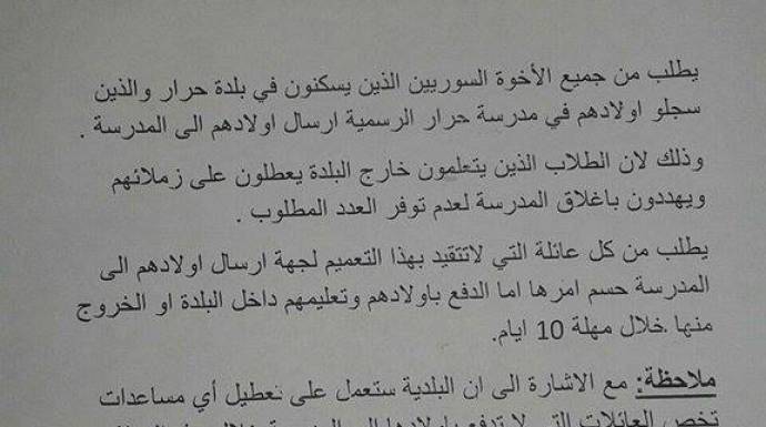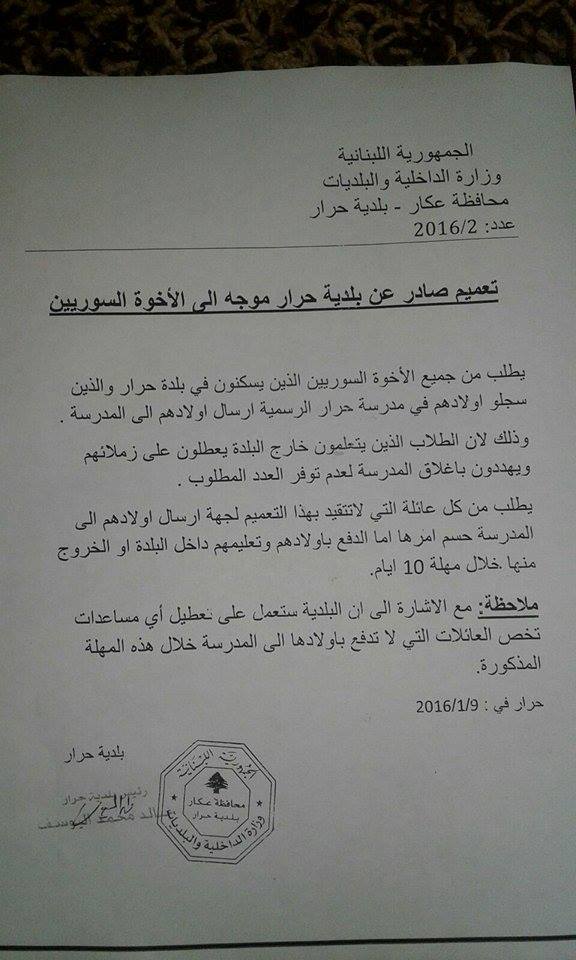 منذ عدة أيام، عادت بلدية (حرار) اللبنانية، وأصدرت إعلاناً رسمياً ممهوراً بتوقيع وختم بلديتها، يدعو، بصيغة فيها تهديد، اللاجئين السوريين إلى إرسال أبنائهم للمدارس الرسمية خلال 10 أيام، ومن لا يستجيب سيُعمل على طرده من مكان سكنه.