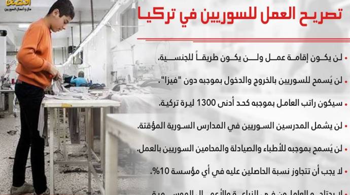 واستطرد "إن إقامة العمل في تركيا تخول حاملها التقدم للحصول على الجنسية التركية، والخروج والعودة إلى تركيا دون حاجة إلى فيزا، بينما هذا الحق غير موجود لمن يحصل على تصريح بالعمل بموجب القرار الصادر لتنظيم عمل السوريين في تركيا، كما أن تصاريح العمل ستكون محددة جغرافياً ضمن بعض المناطق وبعض المهن ووفق النسبة التي حددها القرار".
