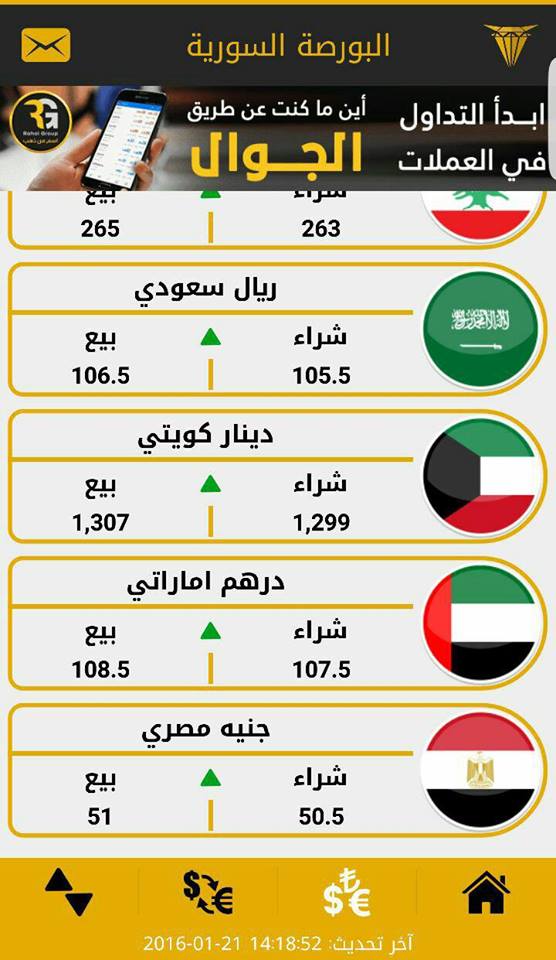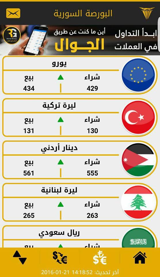 ننشر فيما يلي قائمة بأسعار بعض العملات العربية والأجنبية مقابل الليرة السورية، عصر اليوم الخميس، وذلك حسب صفحة "البورصة السورية"، المتخصصة بأسعار العملات والذهب في سوريا:
