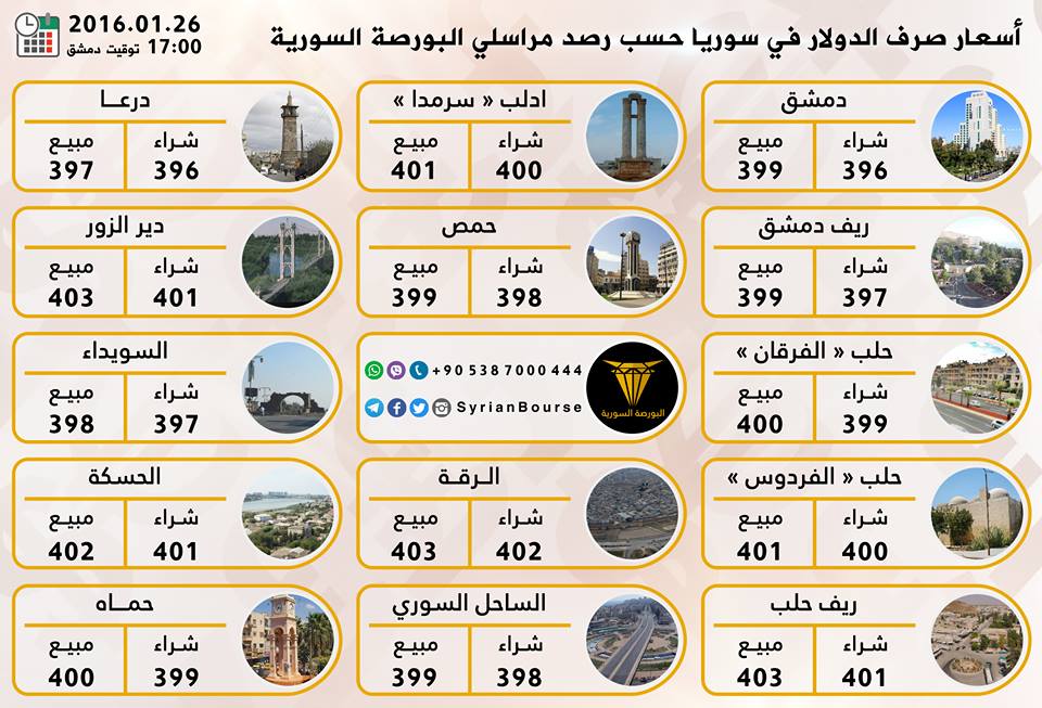 فيما سجل الدولار 403 ليرات في الرقة ودير الزور ومناطق من ريف حلب.