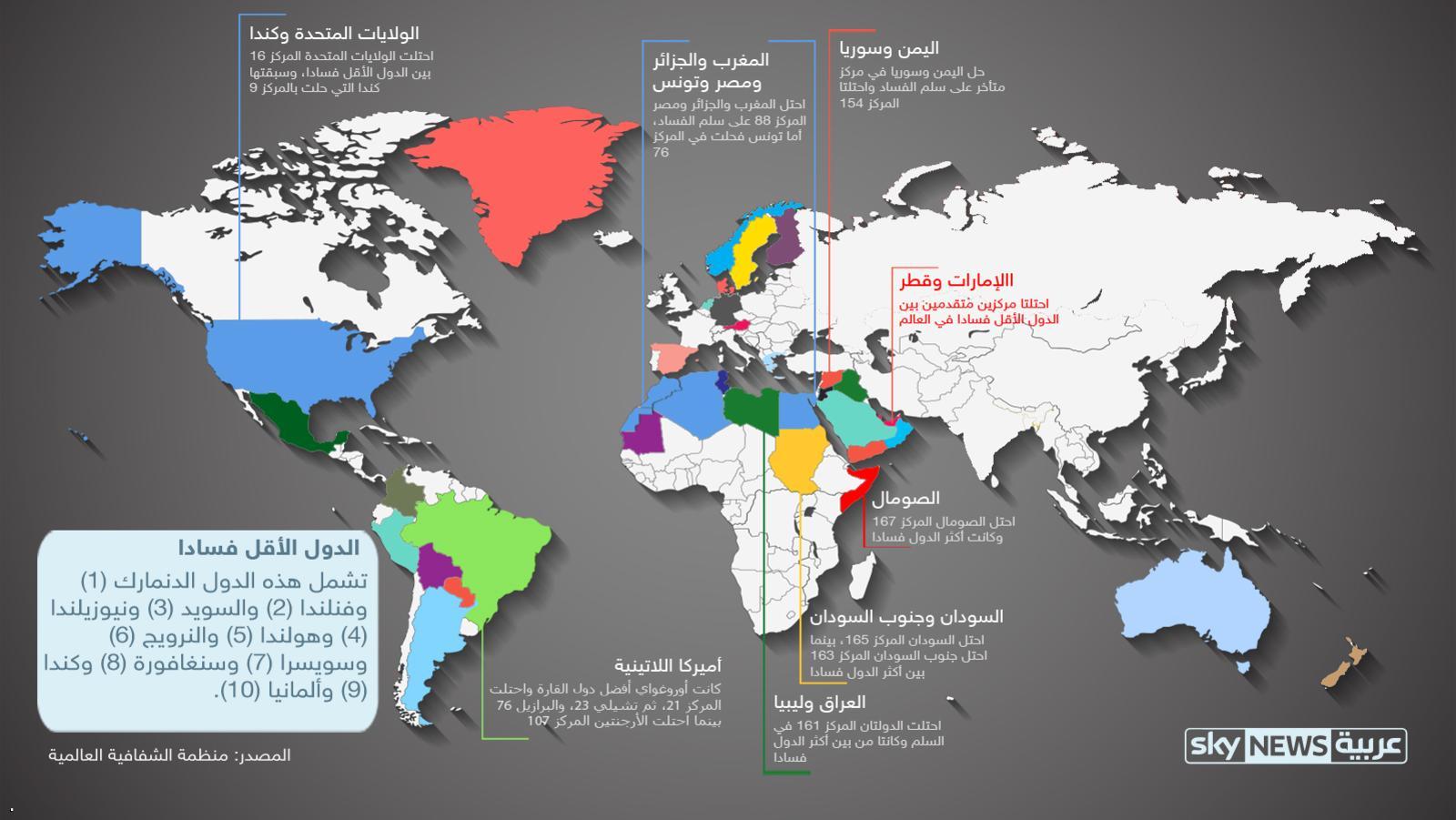 واحتلت تونس المركز 76، ثم سلطنة عمان وحلت في المركز 60، بينما جاءت الكويت في المركز 55 والبحرين (50) والسعودية (48) والأردن (45) والإمارات (23) وقطر (22)، والدولتان الأخيرتان من بين الدول المتقدمة على سلم الشفافية والأقل فساداً.