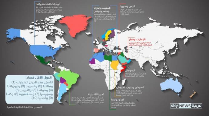 أما الدول الأكثر شفافية وتكاد تخلو من الفساد، فهي الدنمارك التي حلت أولاً، وتبعتها فنلندا في المركز الثاني والسويد ثالثة، ثم نيوزيلندا في المركز الرابع، وهولندا خامسة والنرويج سادسة، وتلتها سويسرا وسنغافورة وكندا وألمانيا على الترتيب.