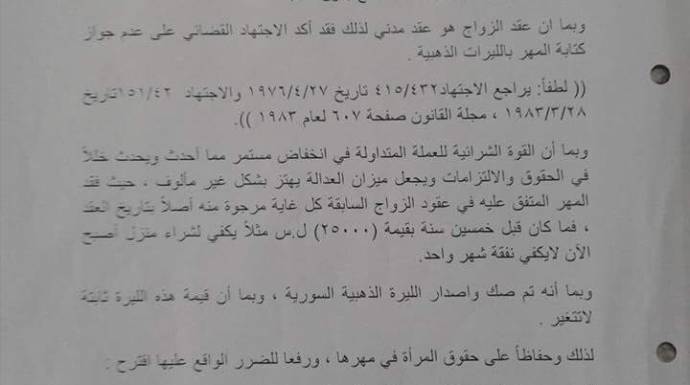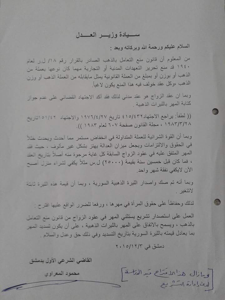 وبحسب وثيقة تداولتها مواقع إعلامية كثيرة موجهة إلى وزير العدل في حكومة النظام ومؤرخة بتايخ 3-12-2015، اقترح القاضي الشرعي الأول، العمل على استصدار تشريع يستثني المهر في عقود الزواج من قانون منع التعامل بالذهب، ويسمح بالاتفاق على المهر بالليرات الذهبية وذلك حفاظاً على حقوق المرأة في مهرها ورفع الضرر الواقع عليها.