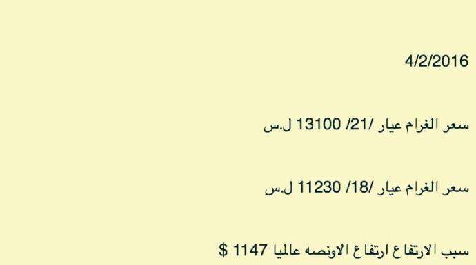وقفز غرام الـ 21 ذهب، 300 ليرة، ليصبح بـ 13100 ليرة، فيما أصبح غرام الـ 18 بـ 11230 ليرة. وهي أسعار غير مسبوقة في تاريخ سوريا.