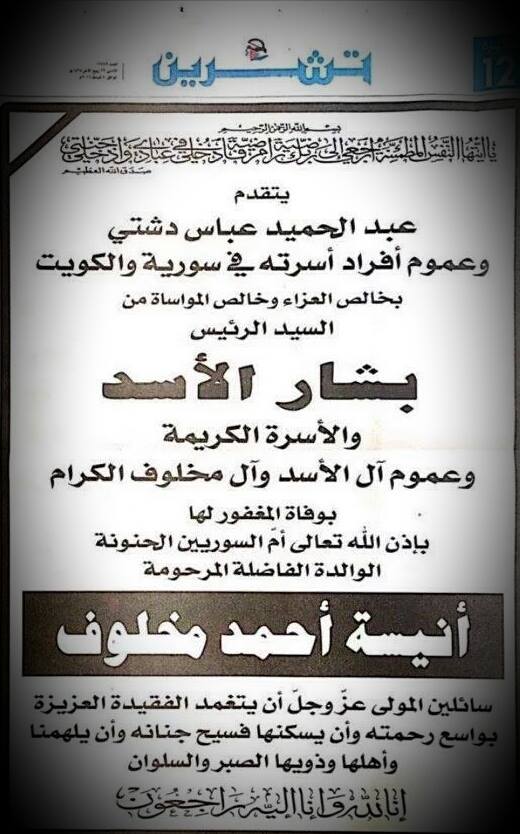 نشرت صحيفة "تشرين" التابعة للنظام رسالة تعزية بوفاة والدة بشار الأسد، أنيسة مخلوف، أرسلها النائب الشيعي في مجلس الأمة الكويتي، عبد الحميد عباس دشتي.