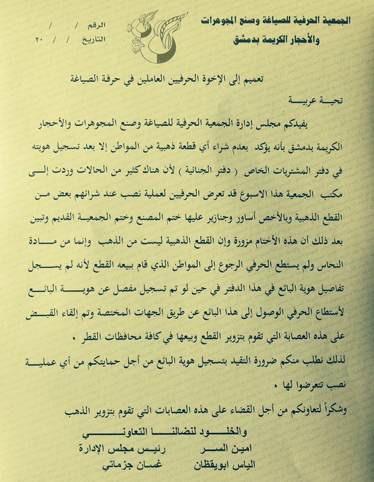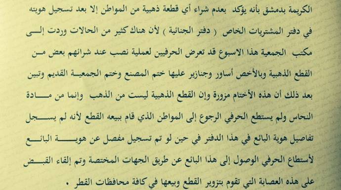وأكد التعميم على الصاغة ضرورة عدم شراء أي قطعة ذهبية من أي كان إلا بعد تسجيل هويته في دفتر المشتريات الخاص من أجل حمايتهم من أي عملية نصب قد يتعرضون لها.