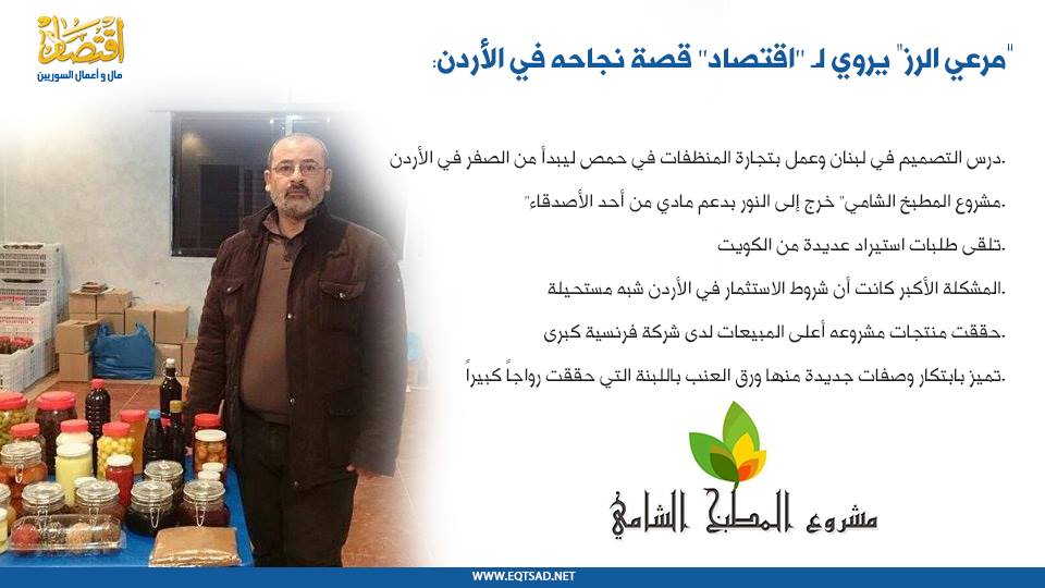 كثير من السوريين خرجوا مرغمين تاركين محلاتهم ومصانعهم ووظائفهم، لاجئين إلى دول الجوار، ليبدؤوا من الصفر أعمالاً جديدة، ومنهم من اضطر إلى تغيير مهنته بالكامل، وهو التحدي الأصعب الذي خاضه أبو رأفت، "مرعي الرز"، الذي تدرج من دراسة التصميم في المعهد الفرنسي في لبنان، بدرجة امتياز، إلى مؤسسة لاستيراد المنظفات في حمص، إلى مشروع المطبخ الشامي في الأردن، لإنتاج المواد الغذائية.