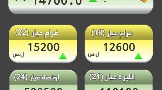 وبقي الذهب، اليوم الخميس، بـ 14700 ليرة لغرام الـ 21، وبـ 12600 ليرة لغرام الـ 18.