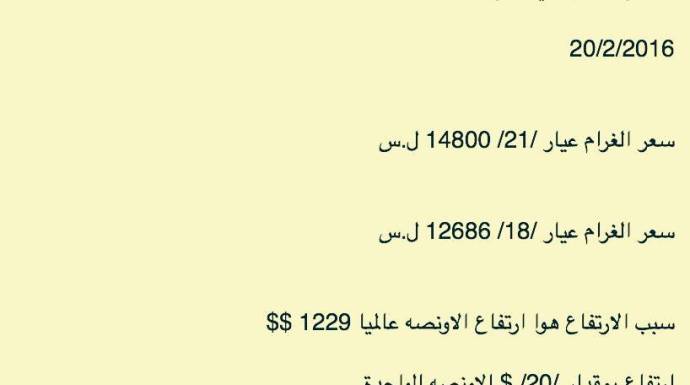 وبررت جمعية الصاغة بدمشق ذلك بأنه ناتج عن ارتفاع سعر الأونصة العالمي، بمقدار 20 دولاراً، بحيث سجلت، 1229 دولار.