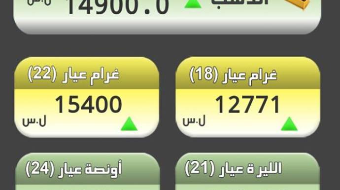 وبقي غرام الـ 21 ذهب بـ 14900 ليرة، وغرام الـ 18 بـ 12771 ليرة.