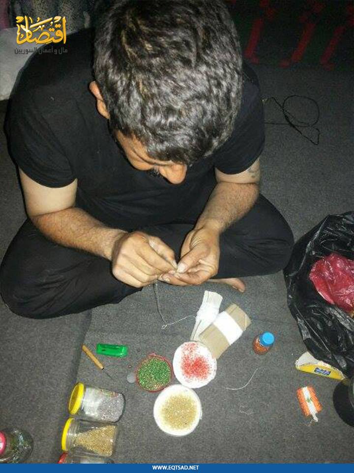 أما عن آلية تسويق أعماله فيقول مشهور إن قطعه الخرزية تذهب غالباً للسوريين الذين يطلبون منه صنع قلادة أو ميدالية للمفاتيح أو صندوقاً لعلبة المحارم، وغيرها.. ويتم بيعها في خيمته للزبون، أما سعر القطعة فيبدأ من ٧ دولارات، ويصل لعشرين دولار، أما القطع النوعية كصناعة طاووس أو بيت للمصحف، فقد تصل لخمسة آلاف دولار.