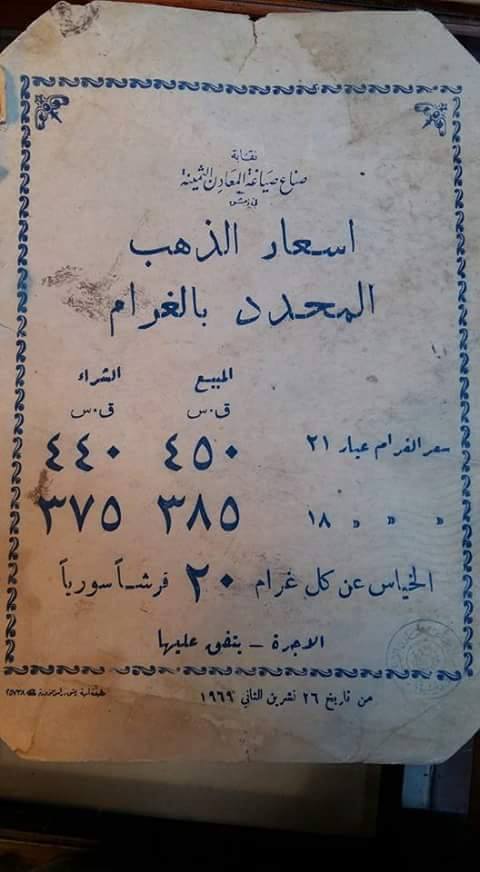 تداول ناشطون على صفحات "فيسبوك" إعلاناً قديماً يعود إلى 16 تشرين الثاني من عام 1969 صادر عن نقابة صياغة المعادن الثمينة في دمشق ويتضمن قائمة بأسعار الذهب المحددة بالغرام حيث بلغ سعر الغرام عيار 21 مبيع 450 ليرة، وشراء 440 ليرة، وبلغ سعر الغرام من عيار 18 مبيع 385 ليرة، وشراء 375 ليرة، والخياس عن كل غرام 20 قرشاً سورياً.