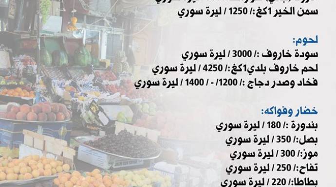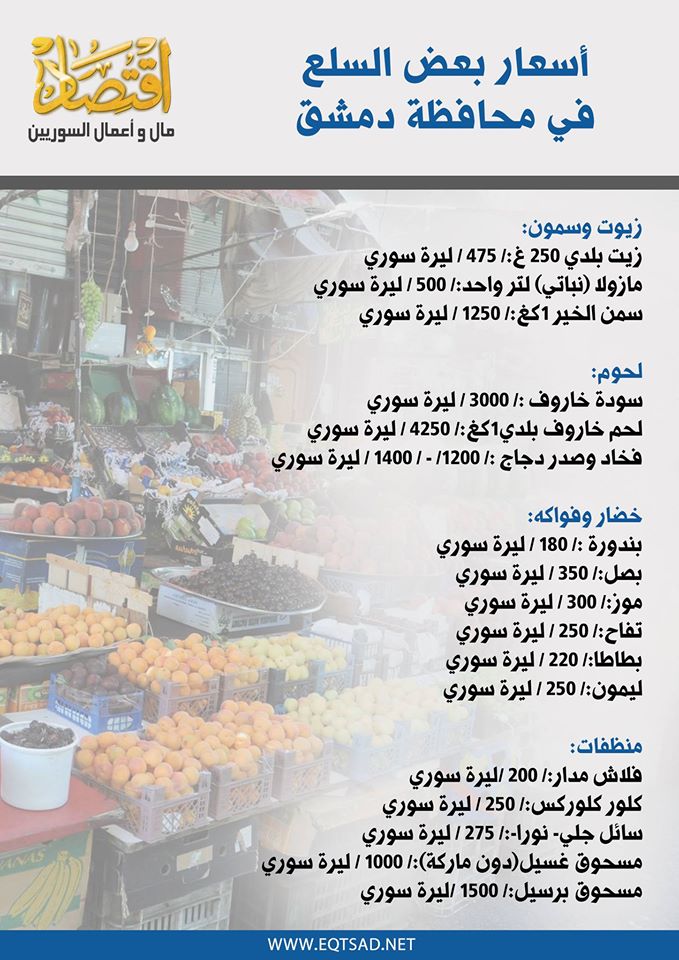 رصد مراسل "اقتصاد" بدمشق أسعار بعض السلع في أسواق العاصمة خلال اليومين الأخيرين، وفيما يلي قائمة بهذه الأسعار: