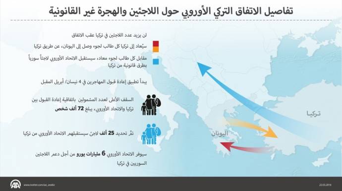 دخلت اتفاقية إعادة قبول المهاجرين غير الشرعيين بين تركيا والاتحاد الأوروبي حيز التنفيذ، الأحد الماضي، وبحسب الاتفاقية سيتم إعادة كل طالب لجوء سوري وصل إلى دول الاتحاد الأوروبي بصورة غير قانونية قادما من تركيا، ومقابل كل شخص معاد، سترسل تركيا لاجئا سوريا من المقيمين على أراضيها إلى الاتحاد، وبذلك تضمن تركيا عدم زيادة عدد اللاجئين لديها. وتمَّ تحديد 25 ألف لاجئ سوري، سيتم توزيعهم على دول الاتحاد الأوروبي، مقابل المعادين من الجزر اليونانية، وذلك بتاريخ 4 نيسان/أبريل القادم، وستعمل تركيا والاتحاد الأوروبي ومفوضية اللاجئين بعد ذلك على تحديد أسماء اللاجئين السوريين الذي سيرسلون للاتحاد الأوروبي.