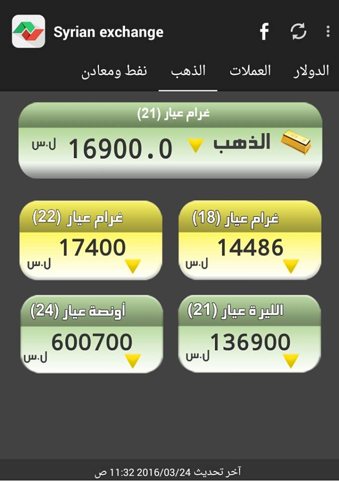 وأصبح غرام الـ 21 بـ 16900 ليرة، فيما أصبح غرام الـ 18 بـ 14486 ليرة، حسب الأسعار الرسمية الصادرة عن جمعية الصاغة بدمشق.
