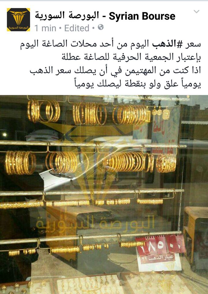 وكانت صفحة "البورصة السورية" نشرت أمس الأحد صورة لإحدى محلات الذهب، وضع سعراً لغرام الـ 21، أعلى من السعر الرسمي بـ 1600 ليرة. لكن الصفحة لم تحدد اسم ومكان المحل، واكتفت بالتأكيد على أن الصورة التُقطت أمس الأحد.