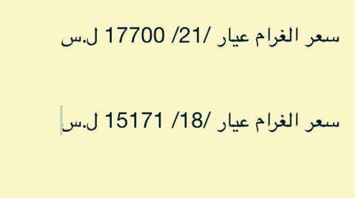 وبقي سعر غرام الـ 21 ذهب، بـ 17700 ليرة، كما بقي غرام الـ 18 بـ 15171 ليرة.
