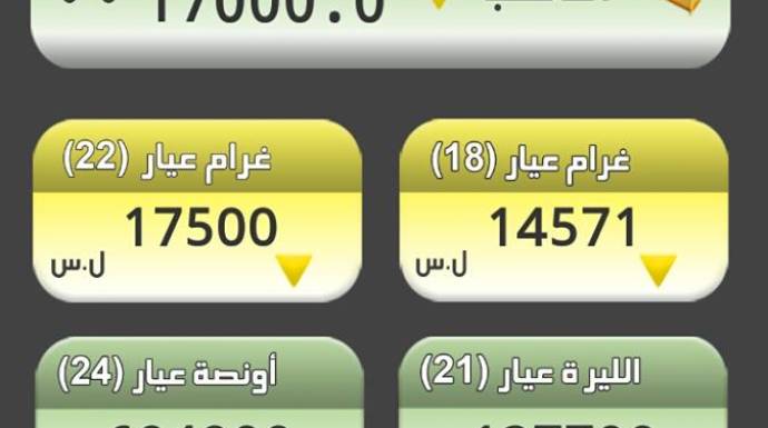 وأصبح غرام الـ 21 بـ 17 ألف ليرة، فيما أصبح غرام الـ 18 بـ 14571 ليرة، وذلك اليوم الاثنين.