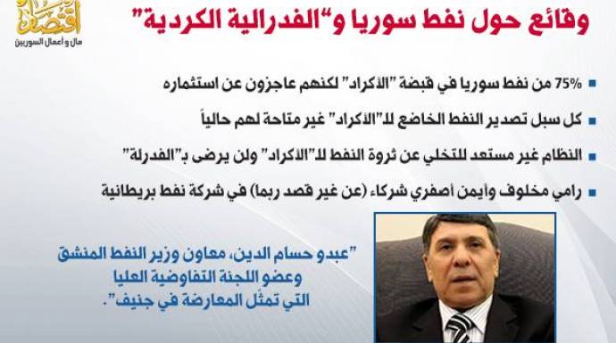 تملك القوى الكردية التي يتزعمها "حزب الاتحاد الديمقراطي"، شمال شرق سوريا، السيطرة على 75% من نفط سوريا، لكنها لا تملك الإمكانيات اللازمة لاستثماره، ولا تحظى حتى الآن بالسبل الملائمة لتصديره، ناهيك عن عدم نيّة النظام التخلي عن تلك الثروة، وبالتالي، لن يقبل النظام بـ "الفدرالية" وفق السيناريو "الكردي".