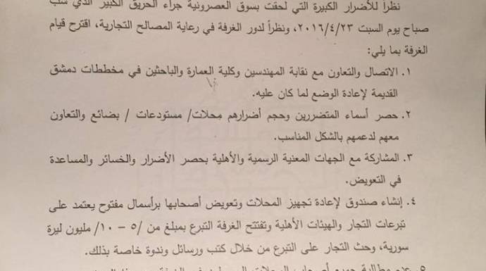 ومن ثم، إنشاء صندوق لإعادة تجهيز المحلات وتعويض أصحابها، يعتمد على تبرعات التجار والهيئات الأهلية، وتفتح الغرفة التبرع بمبلغ من 5 - 10 مليون ليرة سورية, وتحث التجار على التبرع من خلال كتب ورسائل وندوة خاصة بذلك.