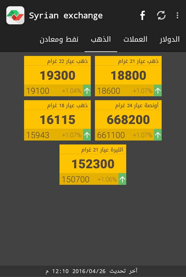 وكانت جمعية الصاغة بدمشق قد رفعت سعر غرام الـ 21 ذهب، صباح اليوم الثلاثاء، 200 ليرة، ليصبح بـ 18800 ليرة، فيما أصبح غرام الـ 18 بـ 16115 ليرة، حسب التسعيرة الرسمية.