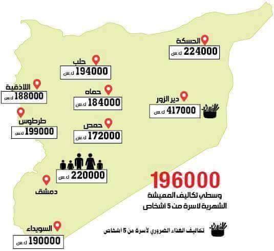 أصدرت صحيفة "قاسيون"، الناطق باسم "حزب الإرادة الشعبية"، الذي يقوده، قدري جميل، انفوغرافيك يحدد بموجبه تكاليف المعيشة الشهرية للضروريات، حسب المحافظات السورية.