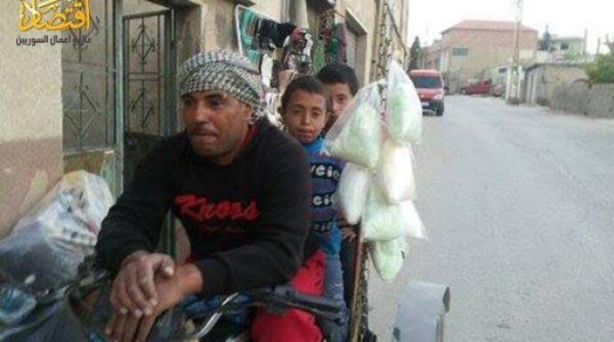 يقود "أبو أيوب" دراجته الخاصة برفقة ولديه أيوب وأحمد حاملاً (غزل البنات) لأطفال المخيمات.