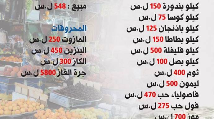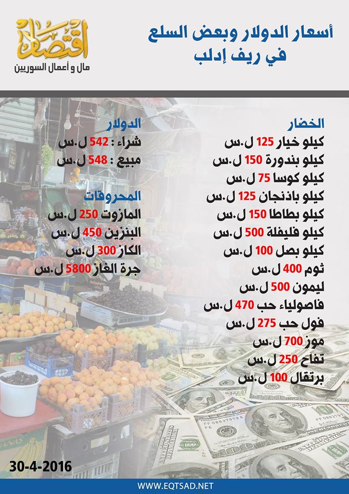 حصل "اقتصاد" على قائمة بأسعار الدولار والمحروقات والخضار، من مصادر ميدانية في بلدات ريف إدلب، وذلك مساء آخر أيام شهر نيسان الفائت، أمس السبت.