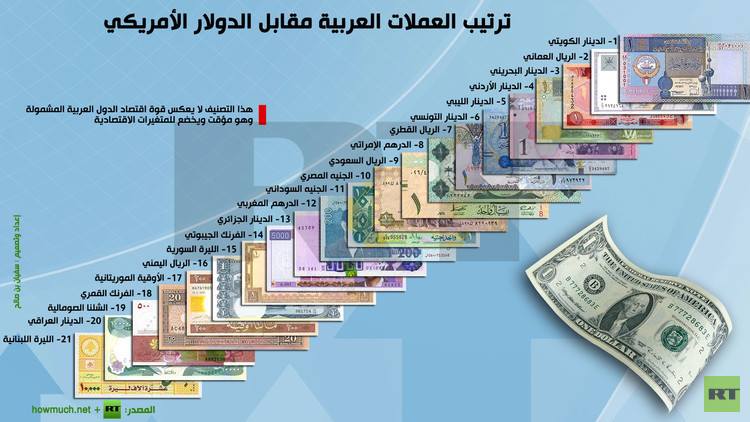 نشر موقع "روسيا اليوم"، انفوغرافيك يستعرض ترتيب العملات العربية مقابل الدولار، حيث احتلت الليرة السورية، المرتبة 15، من أصل 21 عملة.