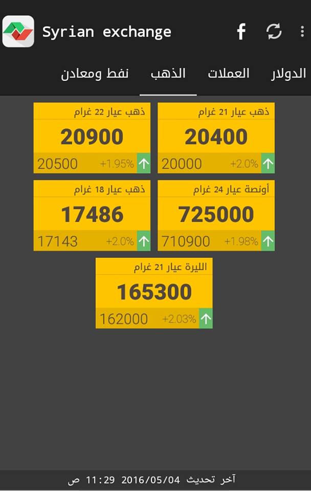صفحة "البورصة السورية"، بدورها، قالت أن سعر غرام الـ 21 ذهب، في المحلات، بـ 20500 ليرة، أي أعلى من التسعيرة الرسمية بـ 100 ليرة. لكنها لم تحدد في أي منطقة من سوريا يُباع الذهب بهذا السعر.