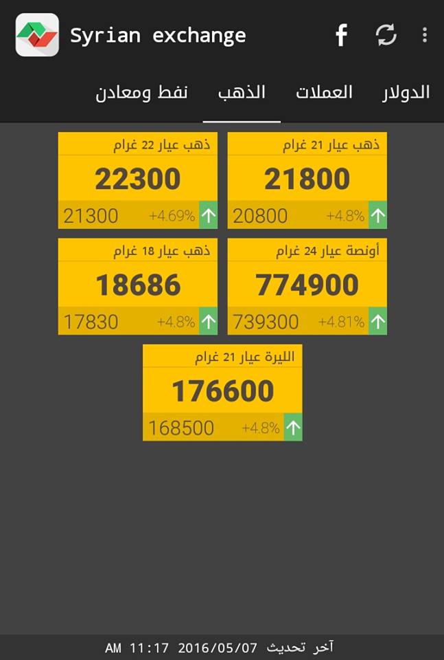 ارتفع غرام الـ 21 ذهب، 1000 ليرة، حسب التسعيرة الرسمية، فيما زاد السعر المتداول في بعض المحلات، وفق صفحة "البورصة السورية"، 1500 ليرة.