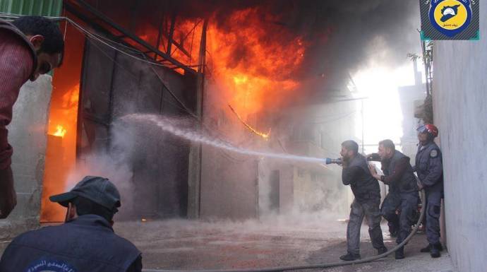 وقال الدفاع المدني بغوطة دمشق أن عنصراً من عناصره، أُصيب بشظايا رصاص متفجر عشوائي، أثناء قيامه بإخماد الحريق المندلع.