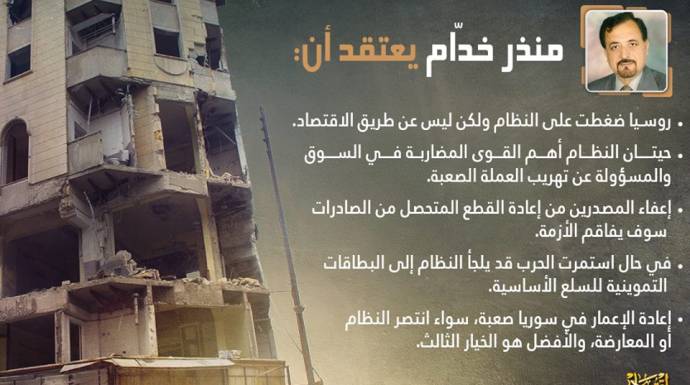 رأى أستاذ الاقتصاد في جامعة تشرين، الدكتور منذر خدام، أن الخوف من نتائج الحرب، أحد أهم أسباب انخفاض الليرة السورية، مشيراً إلى خسارة النظام لكل من النفط، والفوسفات والزراعة في المحافظات الشرقية.