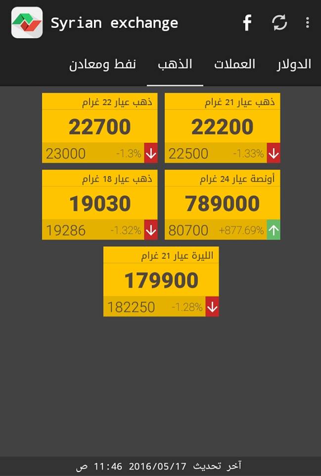 وتراجع الذهب حسب جمعية الصاغة بدمشق، "التسعيرة الرسمية"، 300 ليرة، ليصبح غرام الـ 21 بـ 22200 ليرة، وغرام الـ 18 بـ 19030 ليرة.
