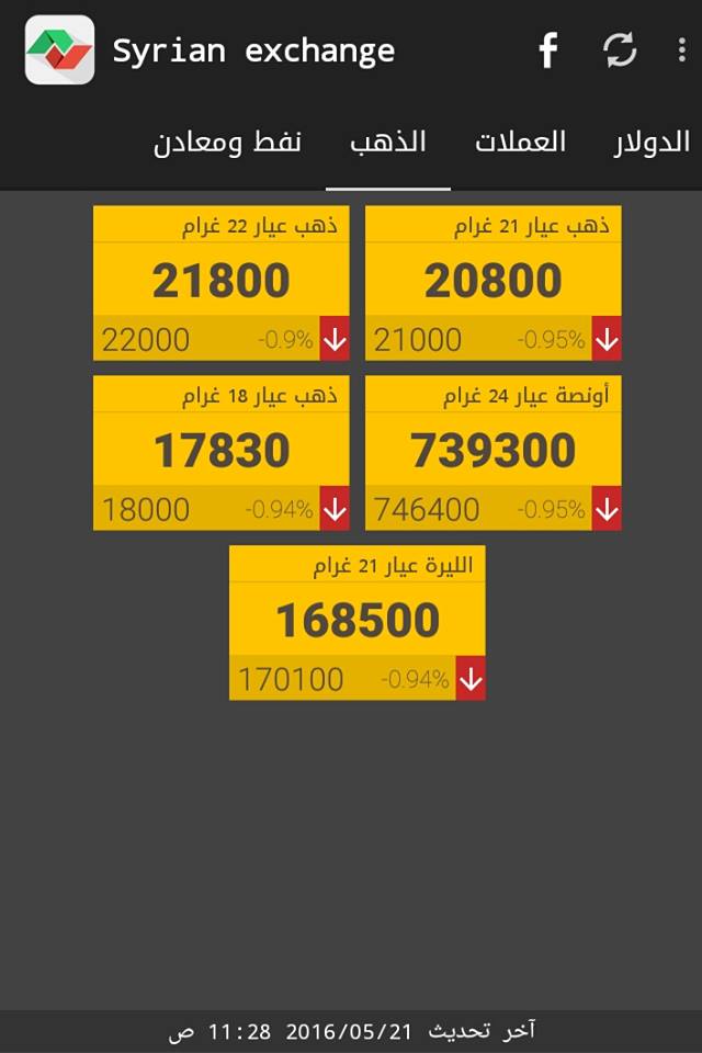فيما صدرت "التسعيرة الرسمية" للذهب عن جمعية الصاغة بدمشق، بتراجع 200 ليرة لغرام الـ 21 ذهب، الذي أصبح بـ 20800 ليرة، فيما أصبح غرام الـ 18 بـ 17830 ليرة.