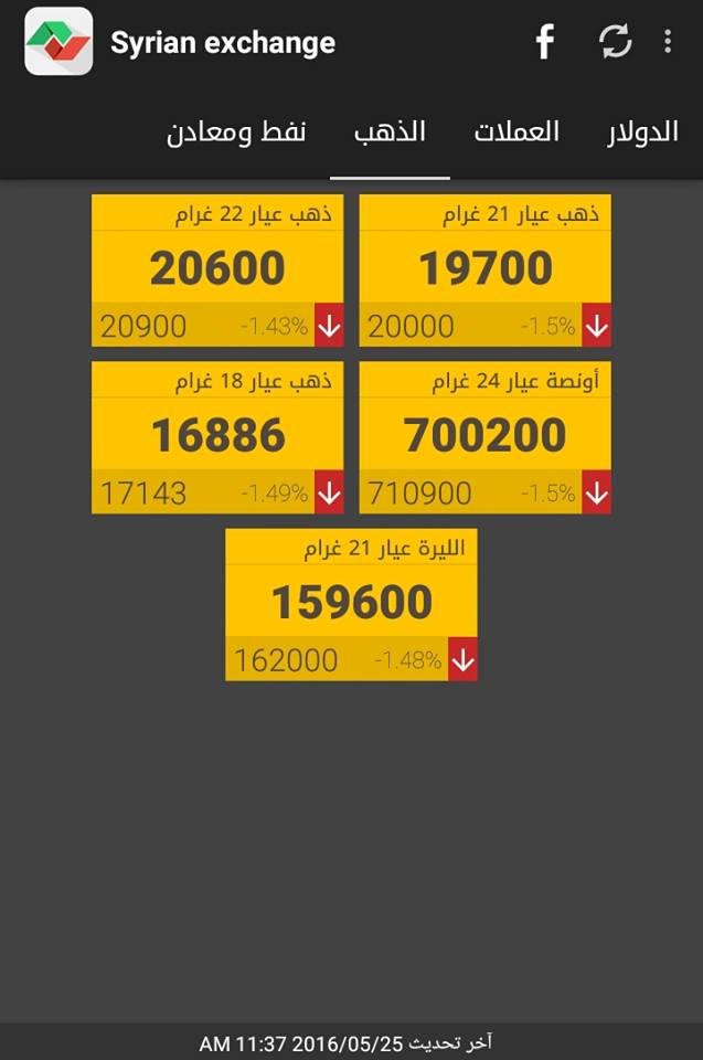 بدورها، قالت صفحة "البورصة السورية" إنها رصدت مبيع غرام الـ 21 ذهب في إدلب، بـ 20600 ليرة، أي أقل 400 ليرة من السعر الذي رصدته في حلب، أمس الثلاثاء.