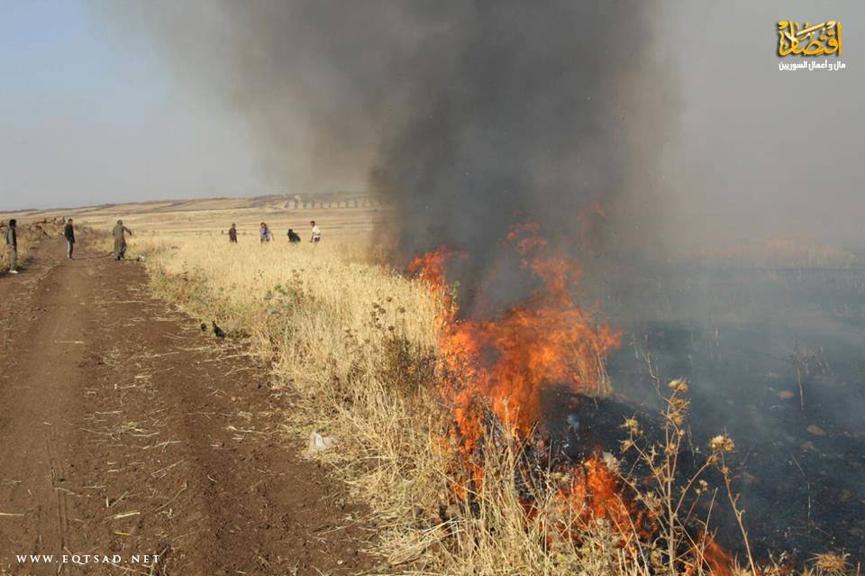 وأفاد مراسل "اقتصاد" في حمص، أن الطيران الروسي يشارك قوات النظام هذا العام في حرق المحاصيل الزراعية مع انطلاق موسم الحصاد، مضيفا بأن 4 غارات شنها طيران حربي روسي منذ يومين على قرية "طلف"، وعلى حقولها الزراعية، ما أدى لاشتعال النيران بأكثر من 50 دونماً مزروعة بالقمح والشعير، ولولا وصول عناصر من الدفاع المدني بقطاع "الحولة" بالوقت المناسب، لامتد الحريق لمساحات شاسعة بسبب الرياح القوية.
