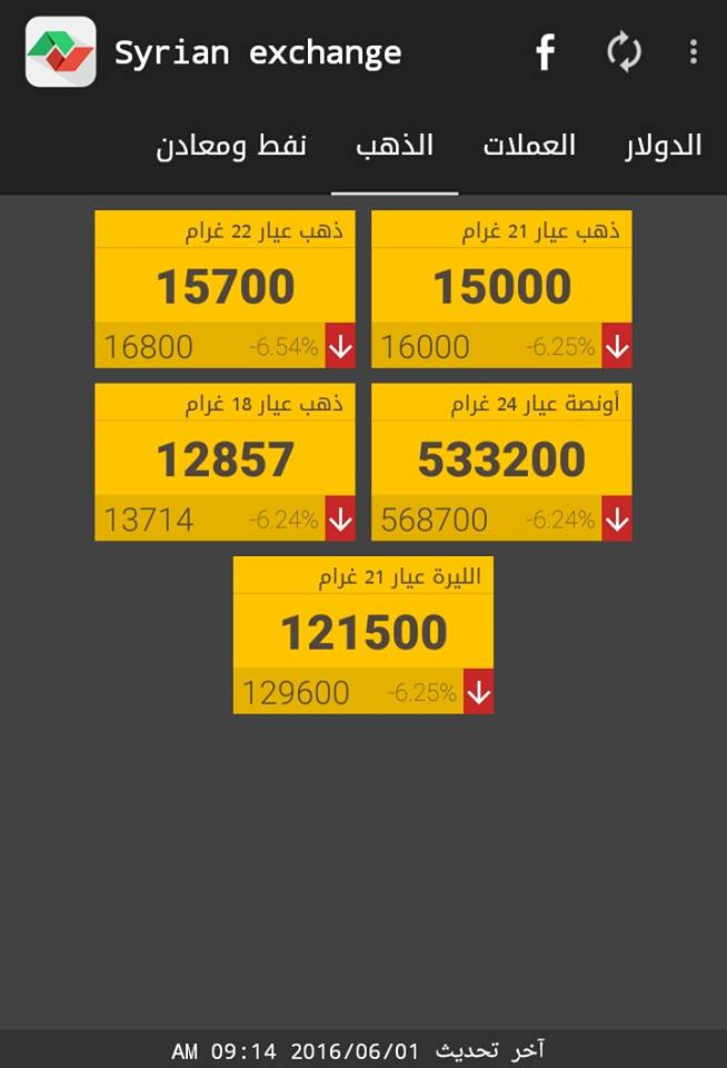 وخسر الذهب بدمشق، 1000 ليرة، لغرام الـ 21، الذي أصبح بـ 15 ألف ليرة، فيما أصبح غرام الـ 18 بـ 12857 ليرة، وذلك حسب "التسعيرة الرسمية" الصادرة عن جمعية الصاغة.