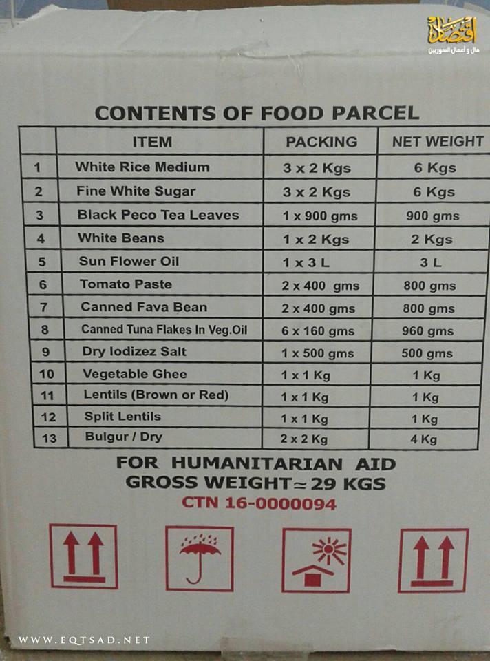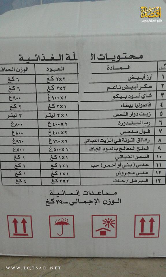وكانت الكرتونة القديمة تحوي، 5 كيلو أرز فأصبحت 6 كيلو، وكانت 5كيلو سكر فأصبحت 6كيلو، وكانت تحوي نصف كيلو شاي فأصبحت تحوي 1 كيلو، أما الفاصولياء حب أبيض، كانت الكرتونة القديمة تحوي 1كيلو، لتصبح 2 كيلو، و1 ليتر زيت دوار الشمس أصبح 2 ليتر، و400غ رب البندورة أصبحت 800غ، يضاف إليها 400غ فول مدمس تضاعفت لتصبح 800غ، بالإضافة إلى 5 علب تونا أصبحت 6 علب، وبقي 1كيلو سمن نباتي على نفس الكمية دون تغيير، ونقص البرغل من 5 كيلو ليصبح 4 كيلو.