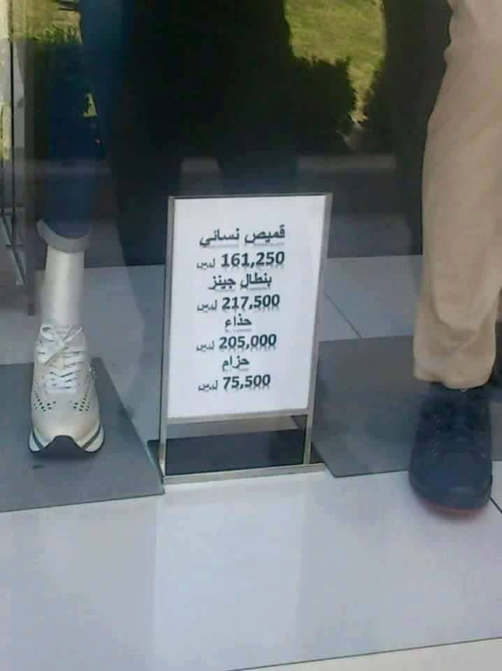 فيما يصل سعر الحذاء إلى 205000 ليرة، وسعر الحزام فقط، 75500 ليرة.