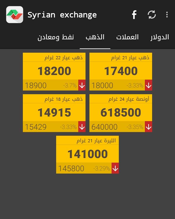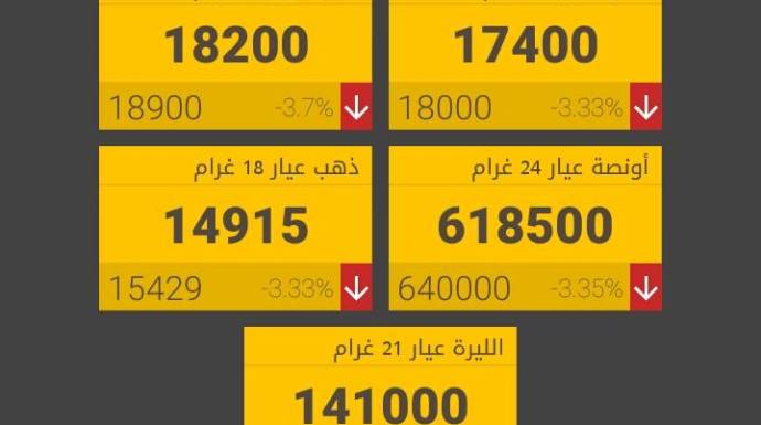 وانخفض غرام الـ 21، 600 ليرة، ليصبح بـ 17400 ليرة، كما انخفض غرام الـ 18 إلى 14915 ليرة.