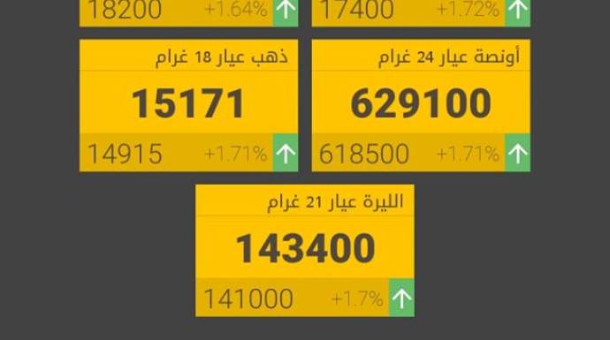 وارتفع غرام الـ 21 ذهب، 300 ليرة، ليصبح بـ 17700 ليرة، فيما ارتفع غرام الـ 18 إلى 15171 ليرة، وذلك حسب "التسعير الرسمية" الصادرة عن جمعية الصاغة بدمشق.